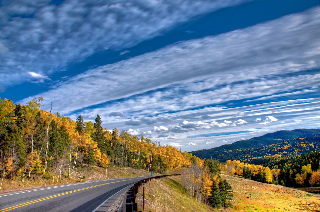 The Enchanted Circle Scenic Byway is an 84-mile loop in northern New Mexico, starting and ending in Taos. During fall, the route becomes one of the most beautiful drives in the state, with golden aspens, auburn pines, and evergreen forests. The loop passes through towns like Angel Fire, Eagle Nest, Questa, Red River, and offers easy access to scenic spots, trails, and campgrounds. Driving without stops takes about 3–4 hours, but most visitors spend a full day exploring.